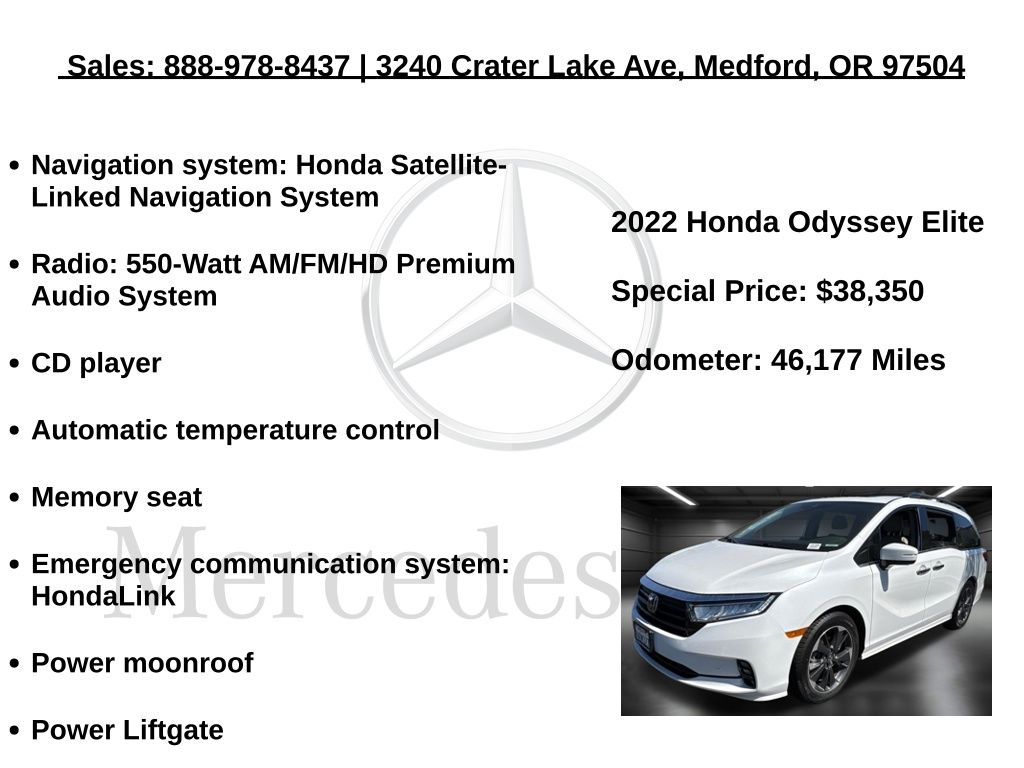 Experience the pinnacle of family-focused luxury and performance with the 2022 Honda Odyssey Elite. Visit our showroom today and let us demonstrate how this exceptional minivan can enhance your lifestyle. We're confident that once you take it for a test drive, you'll be captivated by its unparalleled capabilities and refined sophistication.